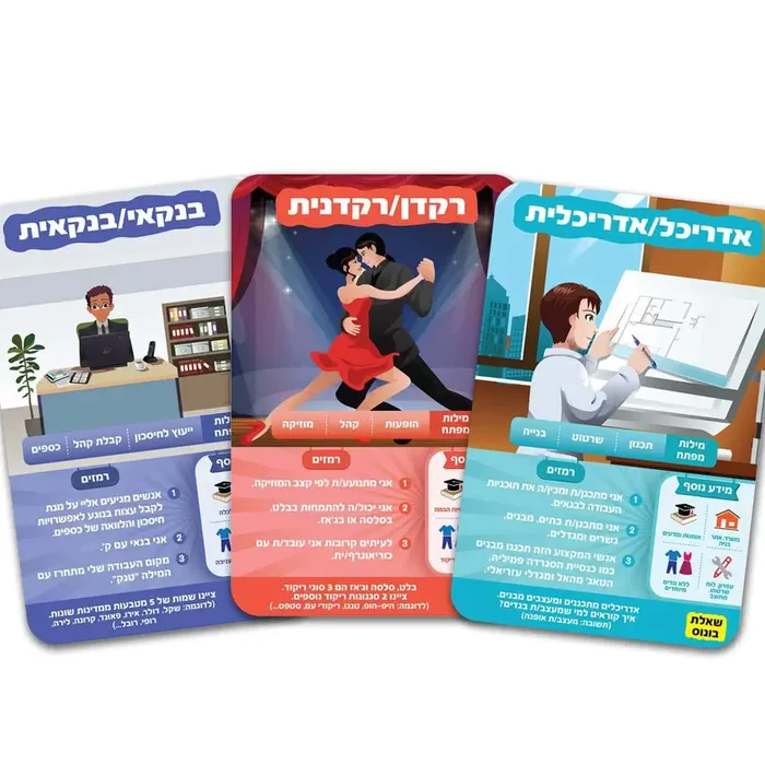 מה תרצו לעשות כשתהיו גדולים? זהו משחק הניחושים המושלם! יש מדים מיוחדים למקצוע הזה? הם מופיעים על במה? שאלו עד 10 שאלות של כן/לא, והשתמשו בקלפי הרמז. השחקן/ית או הקבוצה שיזכו ב-7 קלפי משחק – הם המנצחים!