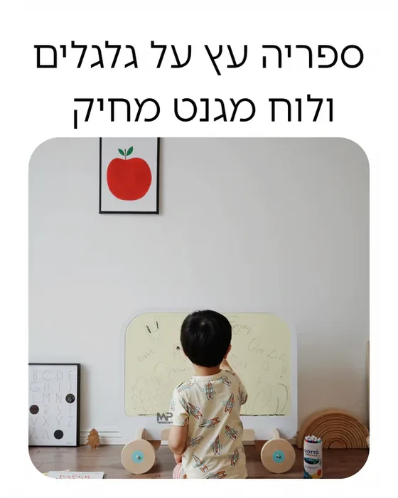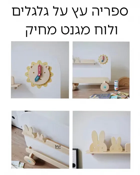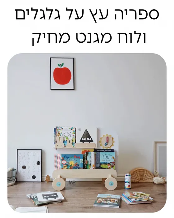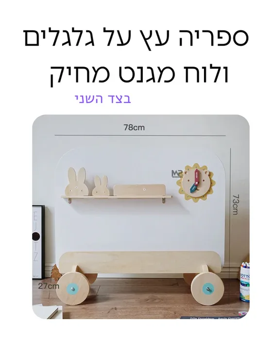 ספריה עץ על כלכלים +לוח מגנט מחיק