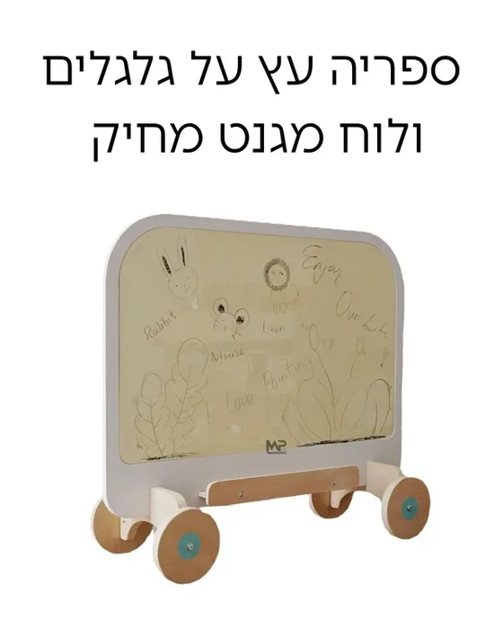 ספריה עץ על כלכלים +לוח מגנט מחיק